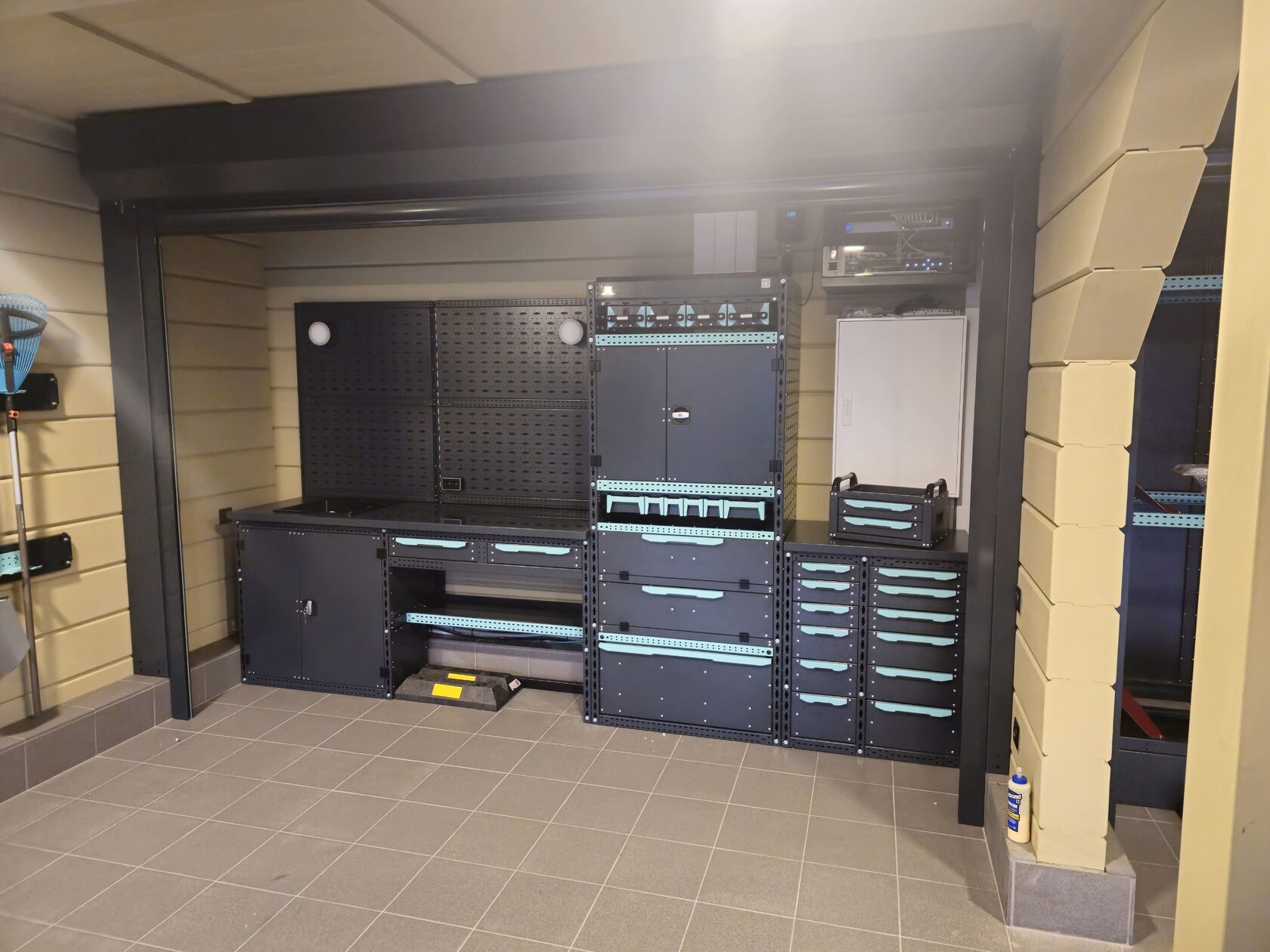 Модульная система собирается на основе каркаса (траверсы и стойки), на каркас крепятся все элементы: полки-вставки, ящики различной глубины и ширины, подвесная лоточная система, а также специальные ложементы для хранения резины. Все элементы модульной системы надежно скрепляются между собой, обеспечивая жесткость конструкции.